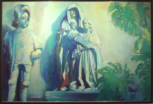 「微香」、「微響」・・・タイトルからもわかるように、今回の個展は「微かなもの」をイメージに作品を描かれたそうです。 例えばそれは、教会を流れる微かな音、射す微かな光。あるいは薔薇から薫る微かな香り。それらは描いている間に作家自身が癒されるものであり、作品を見る人にもその「癒し」を感じてもらえたら何より嬉しい、とお話し下さいました。鮮やかなビタミンカラーと「微」という繊細なイメージとが、見る者の心を癒す響き合いを生んでいます。